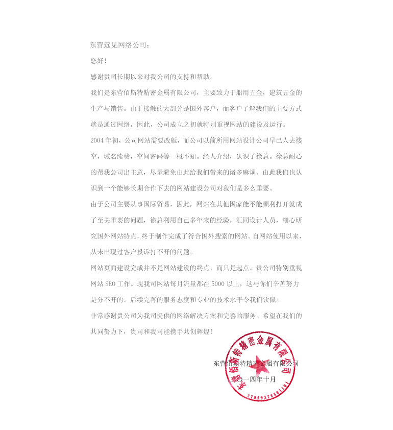 網(wǎng)站頁(yè)面建設(shè)完成并不是網(wǎng)站建設(shè)的終點(diǎn),而只是起點(diǎn)。貴公司特別重視網(wǎng)站S0工作?,F(xiàn)我司網(wǎng)站每月流量都在5000以上,這與你們辛苦努力是分不開(kāi)的。后續(xù)完善的服務(wù)態(tài)度和專(zhuān)業(yè)的技術(shù)水平令我們欽佩。
